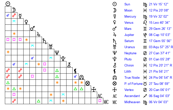 | Moon | 12 Pisces 21 | 25 Gemini 31 | 15 Aries 13 |