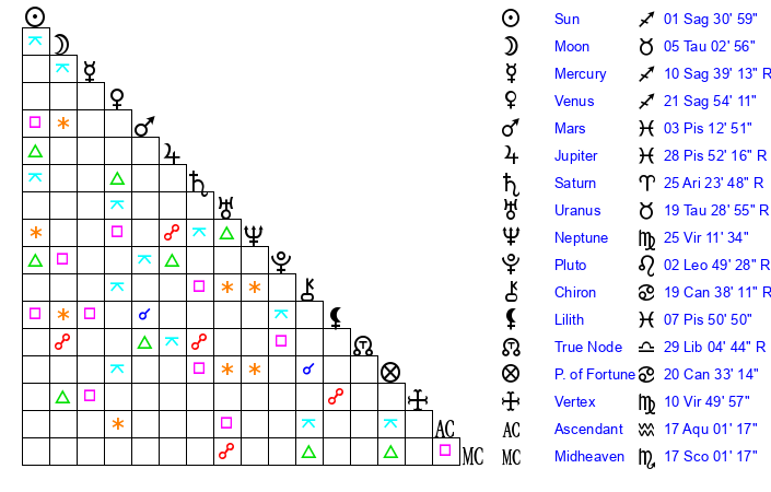 | Sun | 1 Sagittarius 31 | 2 Sagittarius 40 | 28 Aquarius 54 |