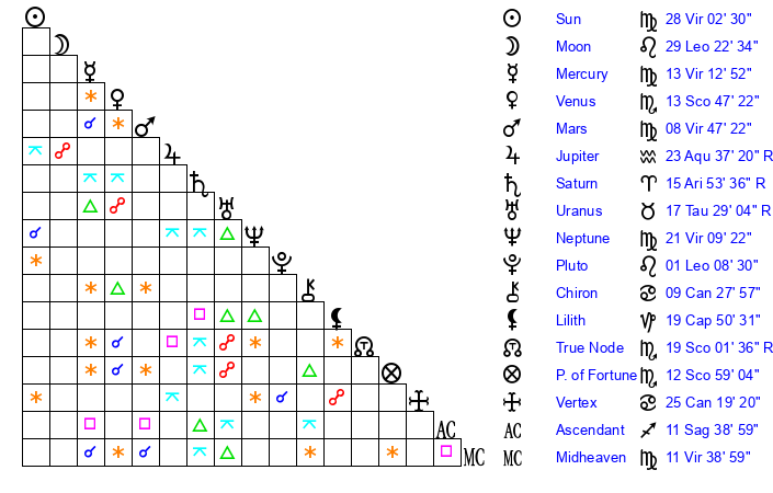| Moon | 29 Leo 19 | 27 Virgo 27 | 9 Scorpio 20 |