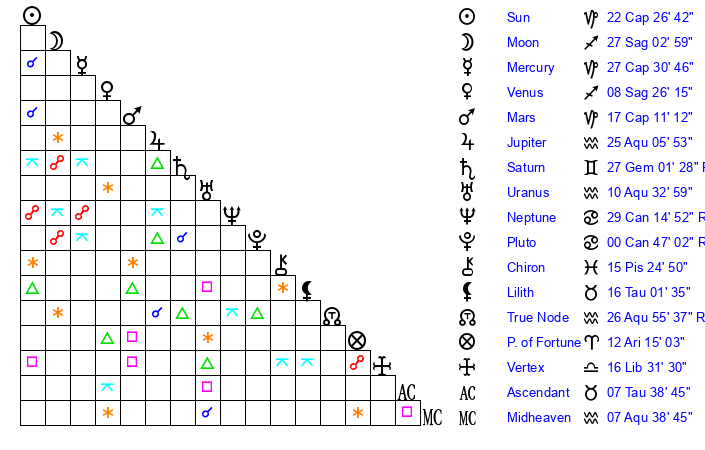 | Sun | 22 Capricorn 27 | 23 Capricorn 31 | 13 Taurus 8 |