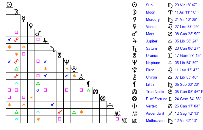 | Moon | 11 Aries 0 | 9 Libra 47 | 9 Pisces 50 |