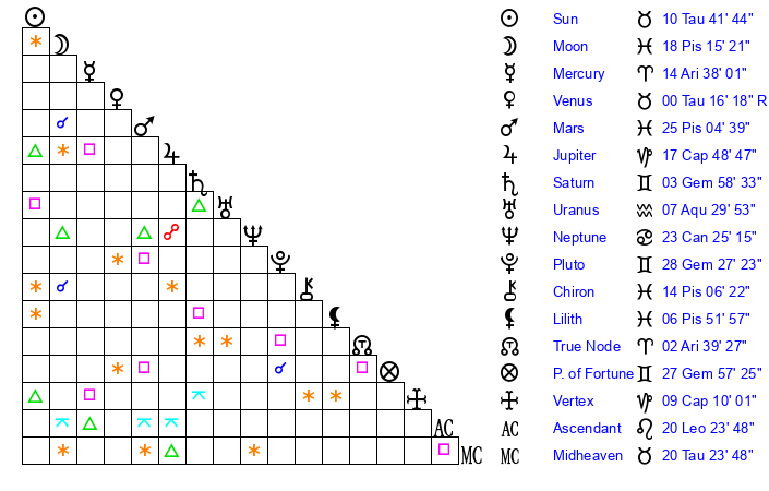 | Moon | 18 Pisces 11 | 5 Cancer 46 | 20 Aries 44 |