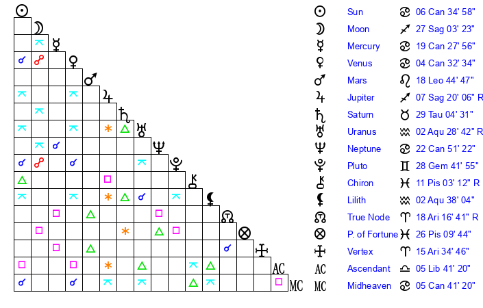 | Moon | 26 Sagittarius 57 | 19 Leo 48 | 13 Aquarius 43 |