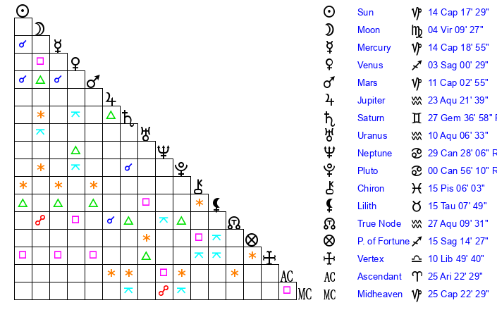 | Mercury | 14 Capricorn 19 | 5 Capricorn 54 | 29 Aries 36 |
