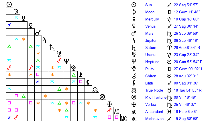 | Moon | 12 Gemini 19 | 6 Scorpio 26 | 2 Virgo 34 |