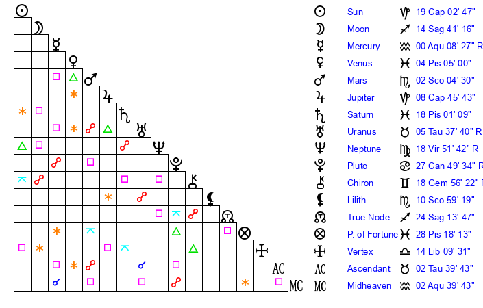 | Moon | 14 Sagittarius 42 | 8 Libra 44 | 13 Pisces 58 |