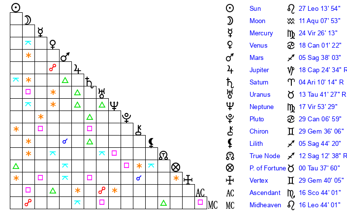 | Sun | 27 Leo 13 | 27 Leo 55 | 23 Scorpio 56 |