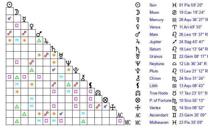 | Sun | 1 Pisces 59 | 3 Pisces 19 | 17 Taurus 59 |