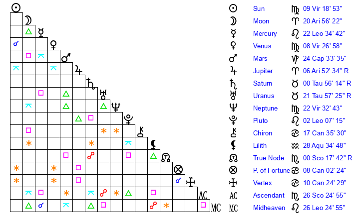 | Neptune | 22 Virgo 33 | 1 Aries 18 | 25 Virgo 15 |