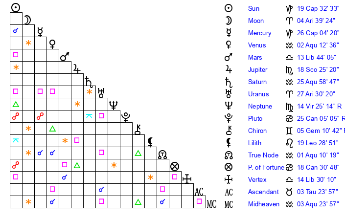 | Sun | 19 Capricorn 32 | 20 Capricorn 42 | 19 Aries 53 |