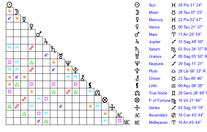 | Moon | 28 Taurus 12 | 28 Scorpio 12 | 20 Sagittarius 40 |
