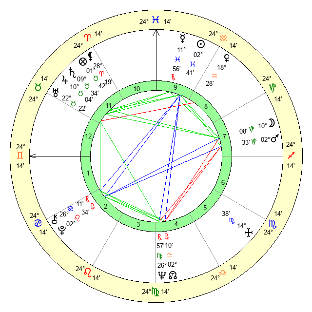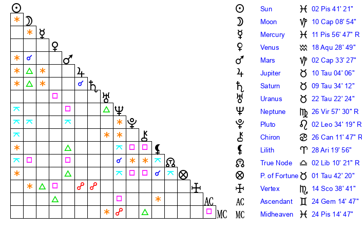 | Mercury | 11 Pisces 56 | 13 Pisces 21 | 7 Gemini 37 |