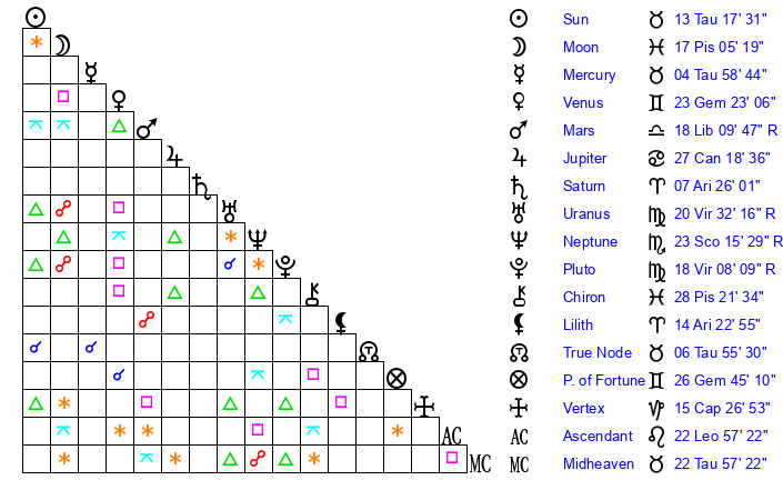 | Moon | 17 Pisces 3 | 12 Leo 56 | 27 Aries 8 |