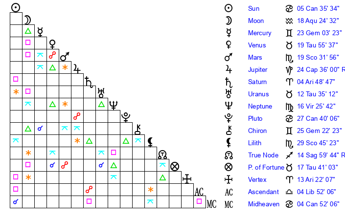 | Pluto | 27 Cancer 40 | 3 Aquarius 12 | 29 Cancer 49 |