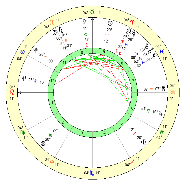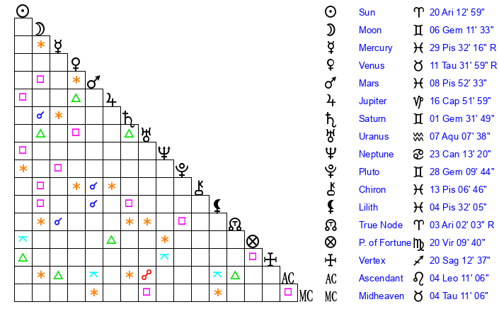| Sun | 20 Aries 13 | 21 Aries 4 | 7 Leo 50 |