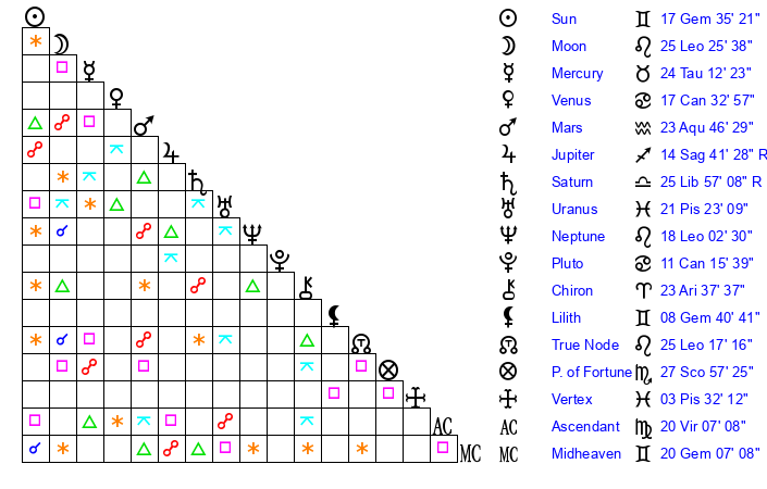 | Sun | 17 Gemini 35 | 18 Gemini 9 | 24 Virgo 30 |
