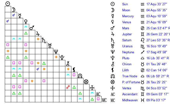 | Sun | 17 Aquarius 33 | 18 Aquarius 9 | 4 Aries 41 |