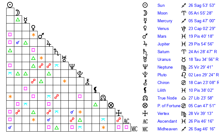 | Sun | 26 Sagittarius 54 | 28 Sagittarius 2 | 23 Pisces 58 |