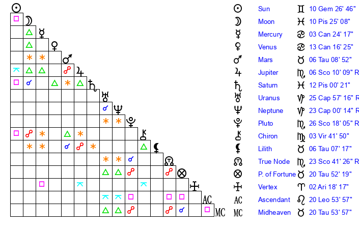 | Moon | 10 Pisces 30 | 17 Leo 47 | 24 Aries 54 |