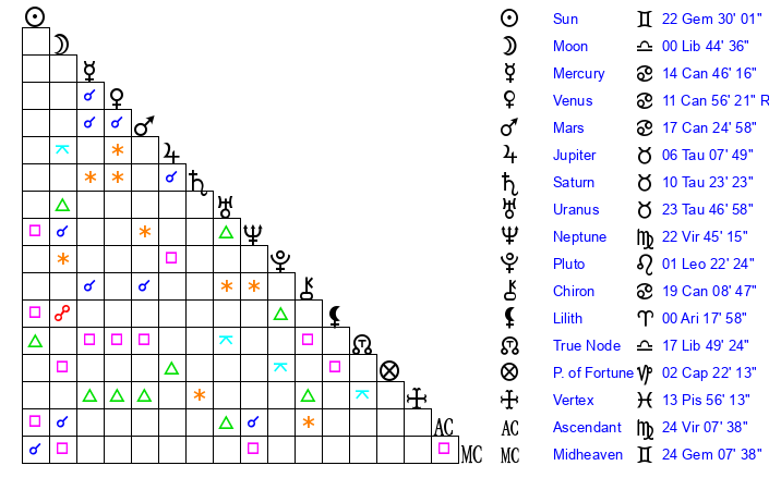 | Sun | 22 Gemini 30 | 22 Gemini 56 | 13 Virgo 55 |