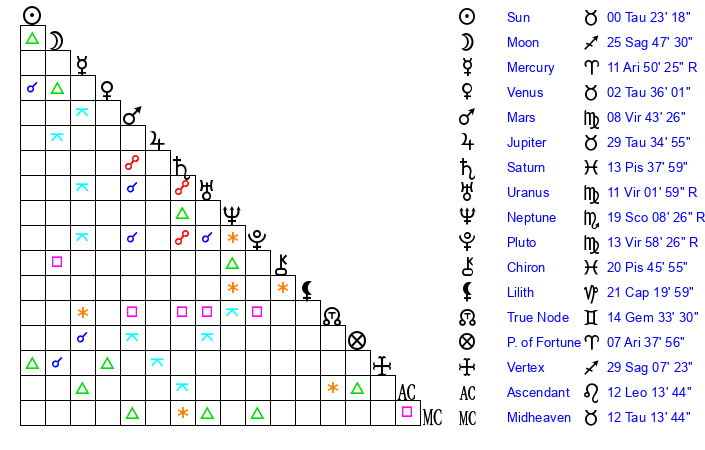 | Uranus | 11 Virgo 6 | 25 Taurus 46 | 11 Virgo 13 |