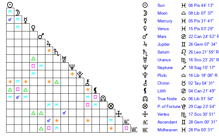| Sun | 6 Pisces 44 | 7 Pisces 20 | 23 Aries 24 |