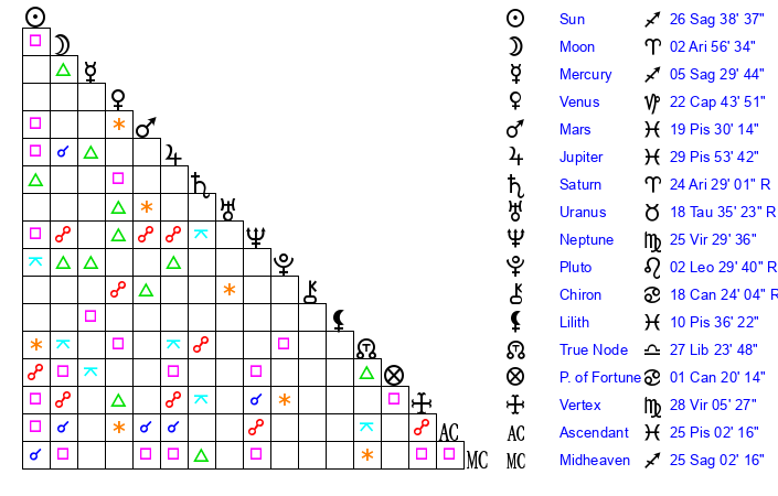 Neptune | 25 Virgo 30 | 27 Pisces 9 | 24 Virgo 11 |