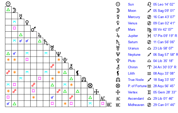 | Moon | 5 Sagittarius 13 | 23 Virgo 28 | 16 Libra 14 |