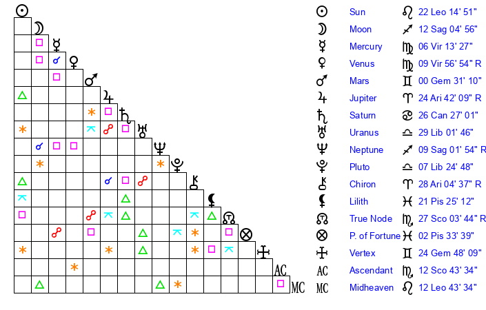 | Sun | 22 Leo 14 | 23 Leo 7 | 10 Libra 50 |