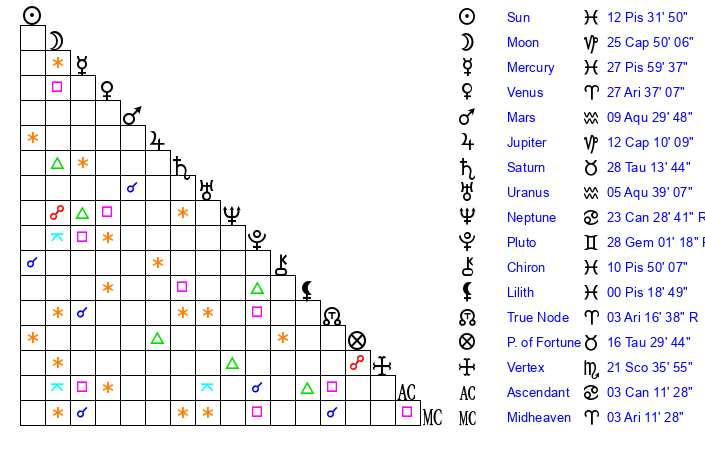 | Sun | 12 Pisces 32 | 13 Pisces 22 | 1 Cancer 35 |