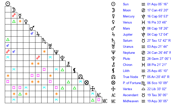 | Uranus | 3 Aquarius 20 | 23 Taurus 18 | 7 Aquarius 31 |