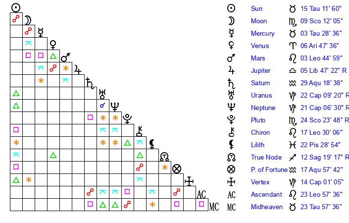 Pluto | 24 Scorpio 23 | 3 Aquarius 48 | 23 Scorpio 31 |