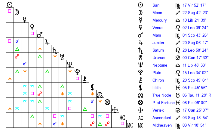 | Sun | 17 Virgo 52 | 18 Virgo 14 | 4 Sagittarius 22 |