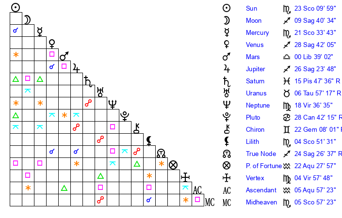 | Sun | 23 Scorpio 10 | 23 Scorpio 35 | 23 Aquarius 35 |