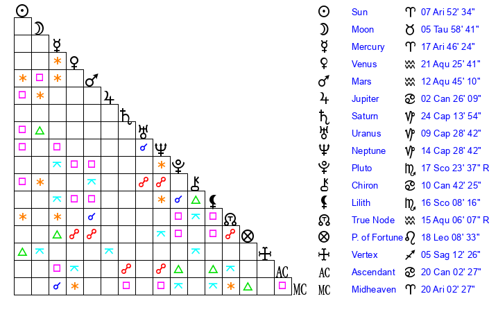 Sun | 7 Aries 52 | 8 Aries 23 | 12 Taurus 9 |
