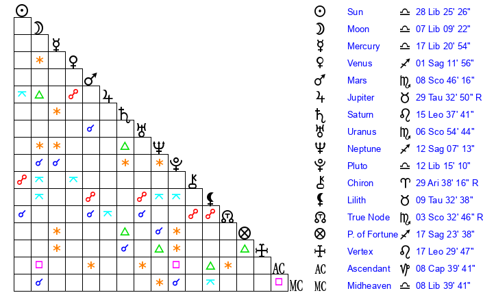 | Mercury | 17 Libra 21 | 21 Scorpio 1 | 4 Capricorn 53 |