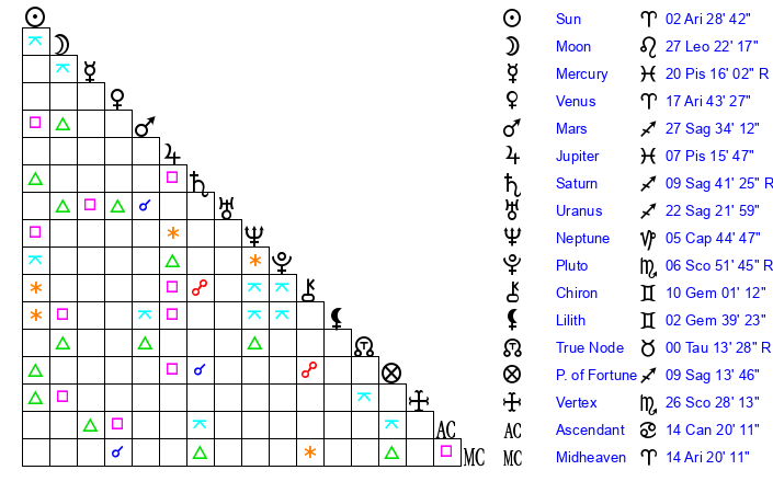 Moon | 27 Leo 18 | 13 Capricorn 47 | 14 Aquarius 14 |