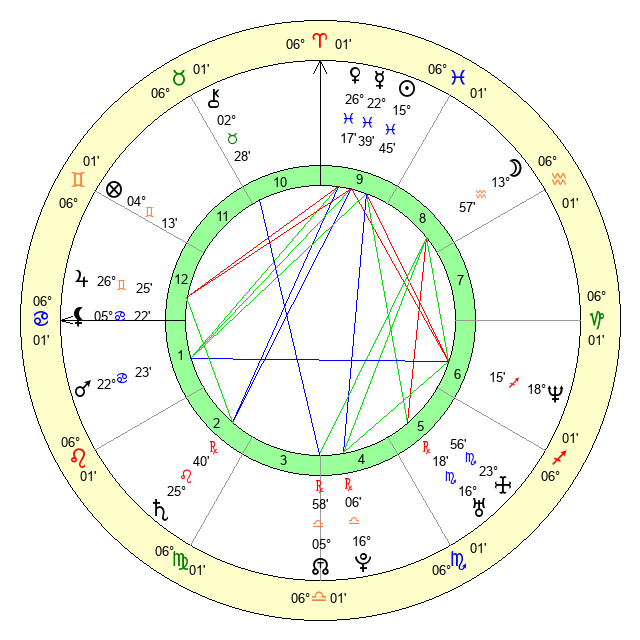 | Moon | 14 Aquarius 4 | 16 Gemini 40 | 26 Libra 10 |