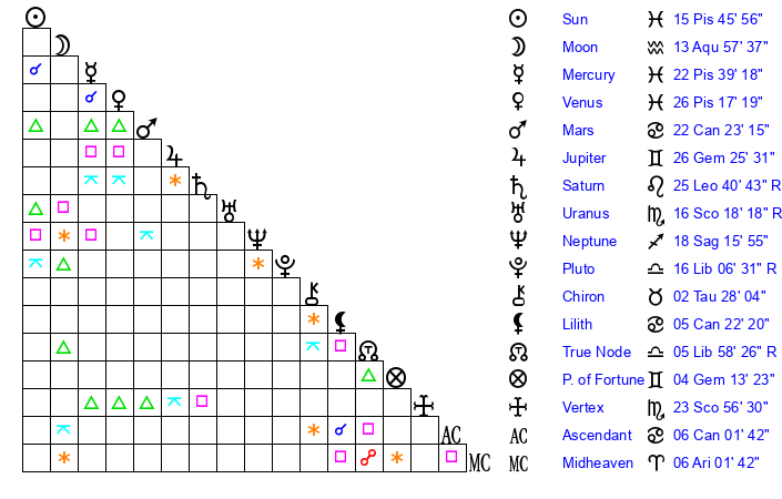 | Moon | 14 Aquarius 4 | 16 Gemini 40 | 26 Libra 10 |