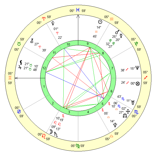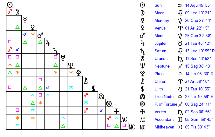 | Sun | 14 Aquarius 46 | 15 Aquarius 7 | 2 Aries 57 |