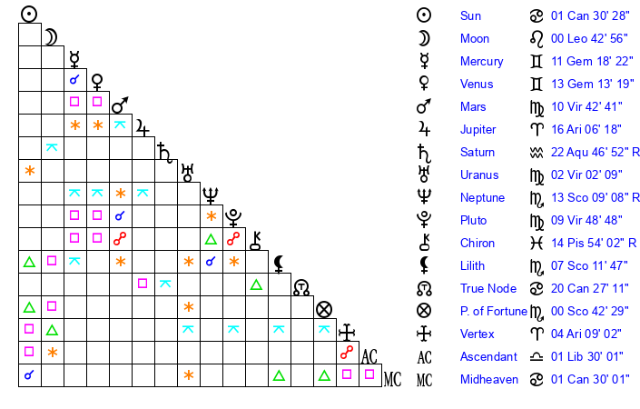 | Sun | 1 Cancer 30 | 2 Cancer 29 | 0 Virgo 48 |