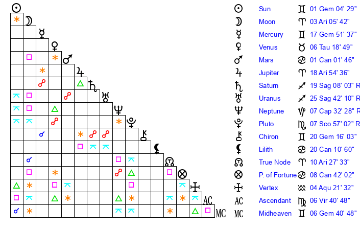 | Jupiter | 18 Aries 59 | 25 Gemini 57 | 25 Aries 50 |