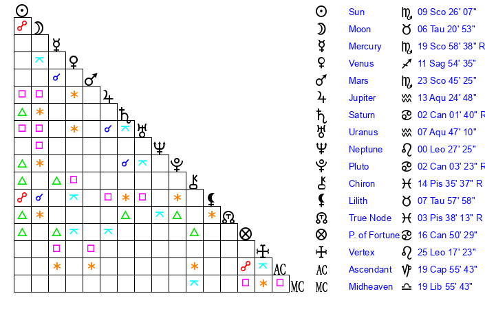 | Mars | 23 Scorpio 45 | 28 Scorpio 41 | 17 Aquarius 34 |
