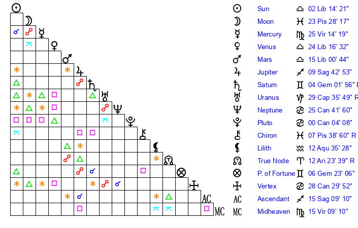 | Venus | 24 Libra 17 | 7 Virgo 34 | 10 Pisces 54 |