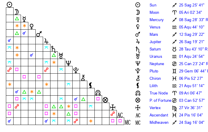 | Sun | 25 Sagittarius 25 | 26 Sagittarius 0 | 19 Aries 14 |