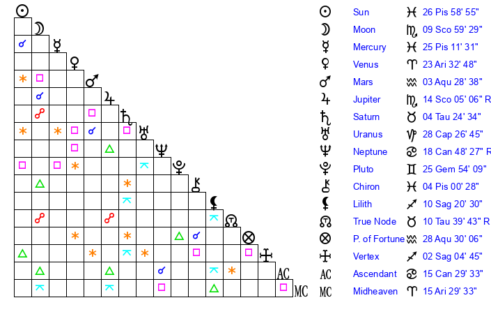 | Sun | 26 Pisces 59 | 28 Pisces 21 | 17 Cancer 18 |