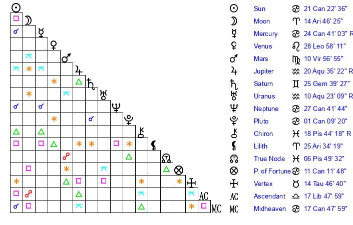 | Jupiter | 20 Aquarius 15 | 7 Cancer 55 | 13 Aquarius 8 |