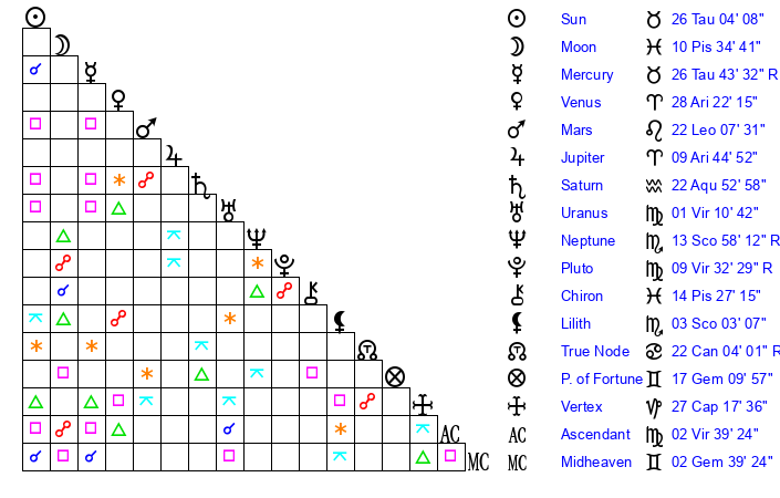 | Moon | 10 Pisces 31 | 23 Capricorn 20 | 27 Gemini 5 |
