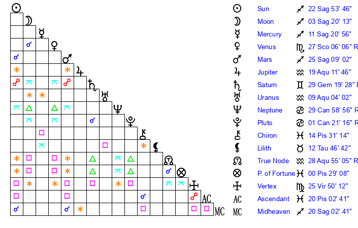 | Sun | 22 Sagittarius 54 | 23 Sagittarius 58 | 14 Aries 49 |