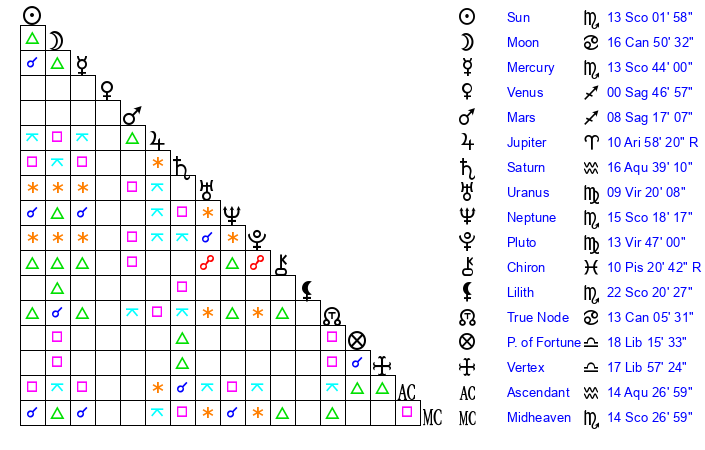 | Neptune | 15 Scorpio 18 | 29 Pisces 41 | 17 Scorpio 20 |
